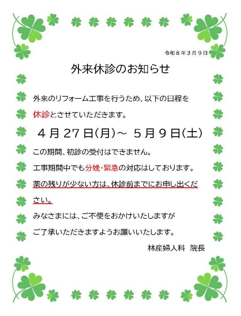 外来のリフォーム工事を行うため、以下の日程を休診とさせていただきます。
