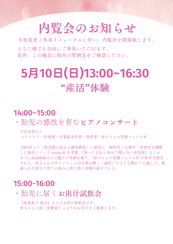 あらかじめお電話をいただければ、お約束の日時にスタッフが院内をご案内いたします。また、妊娠中のあらゆるご相談・ご質問にお答えいたします。ご希望の方は下記までご連絡ください。